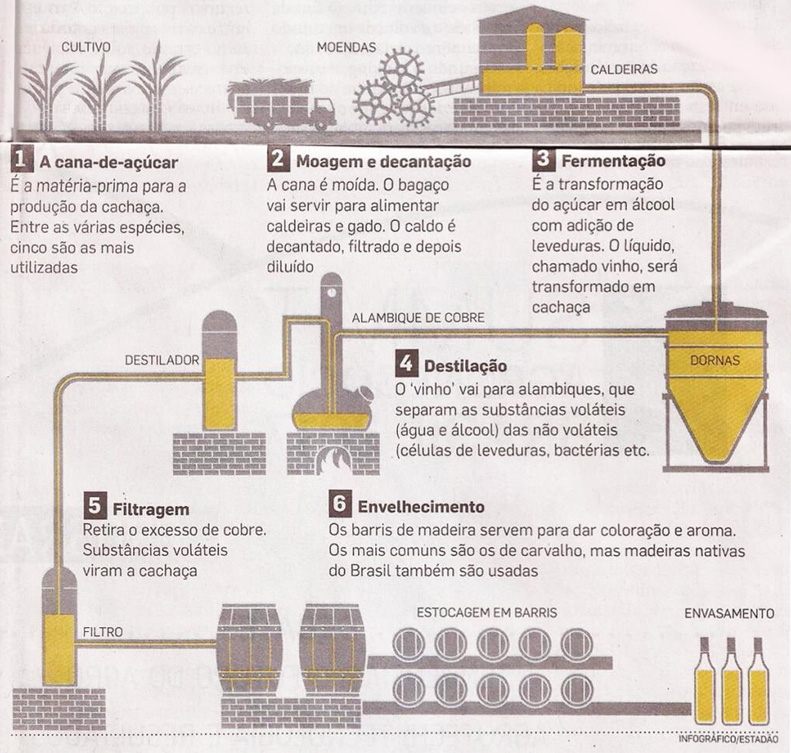 A cachaça é o caldo de cana fermentado e destilado. Na fermentação, microorganismos conhecidos por leveduras convertem o açúcar da garapa em álcool. O produto resultante, chamado de vinho (como o suco fermentado de uvas) é aquecido em alambiques para finalmente transformar-se em cachaça.